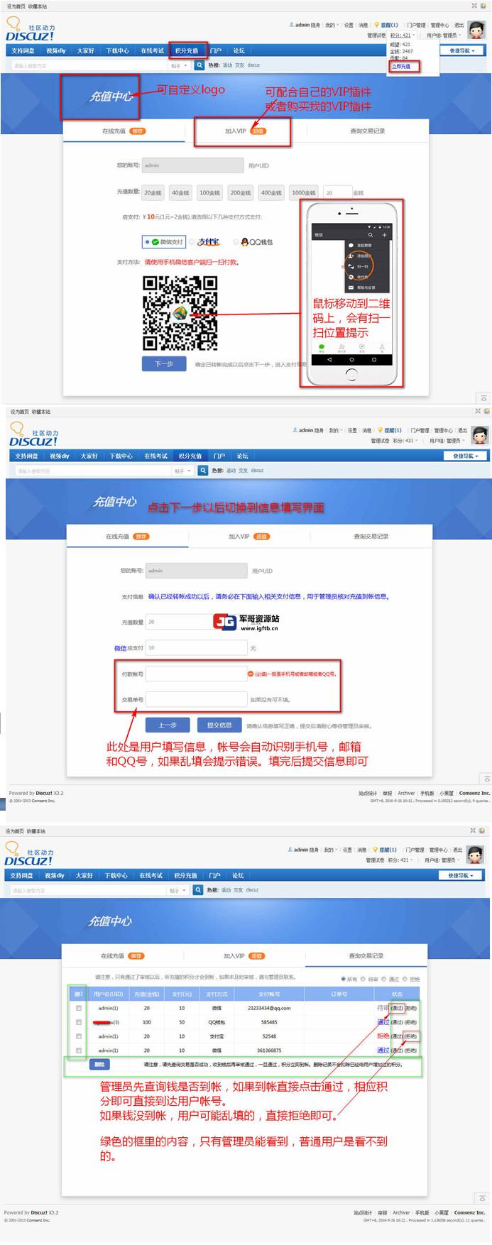 请注意,本插件支持微信支付,支付宝支付,QQ钱包(财富通)支付充值的插件。支持个人帐号,不用签约,支持手机版转帐,支付即时到帐,零手续费,界面美观。