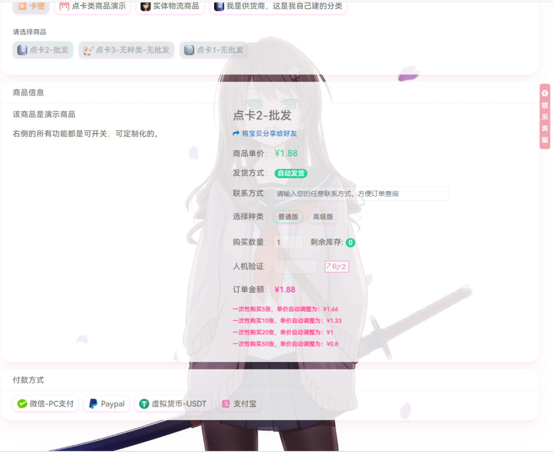 商品销售,支持商品配图、会员价、游客价、邮件通知、卡密预选(用户可以预选自己想购买的那个账号或者卡号)、API对接、强制登录购买、强悍的自定义控件功能、限时秒杀、批发优惠、优惠卷、等众多功能。