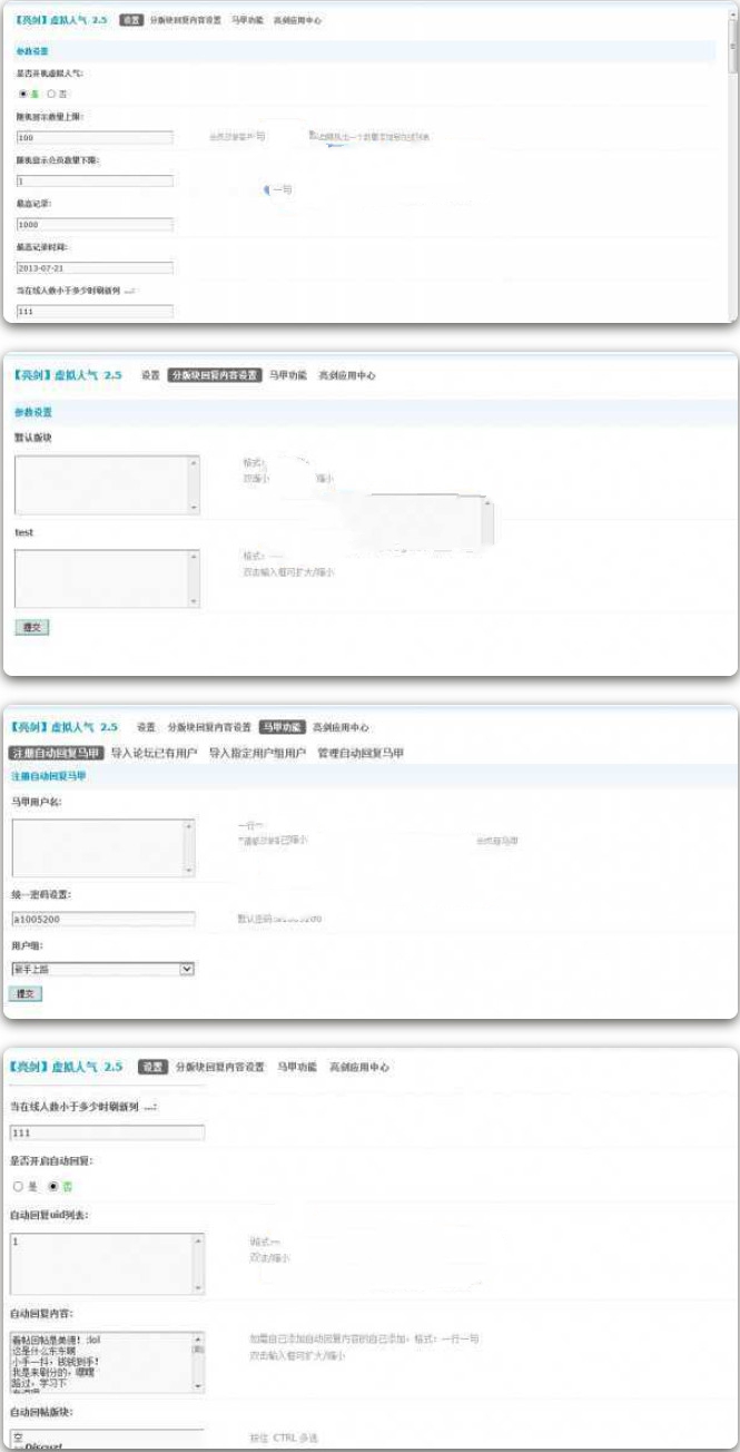 相比以往的自动回贴功能,看起来有点假的问题,亮剑打造虚拟人气插件,随机用户自动回贴,将会自动加入在线会员,论坛首页底部会给予显示,新的在线人数及在线会员数都会完美重新计算,让用户不再能分辨网站人气为虚拟的。
